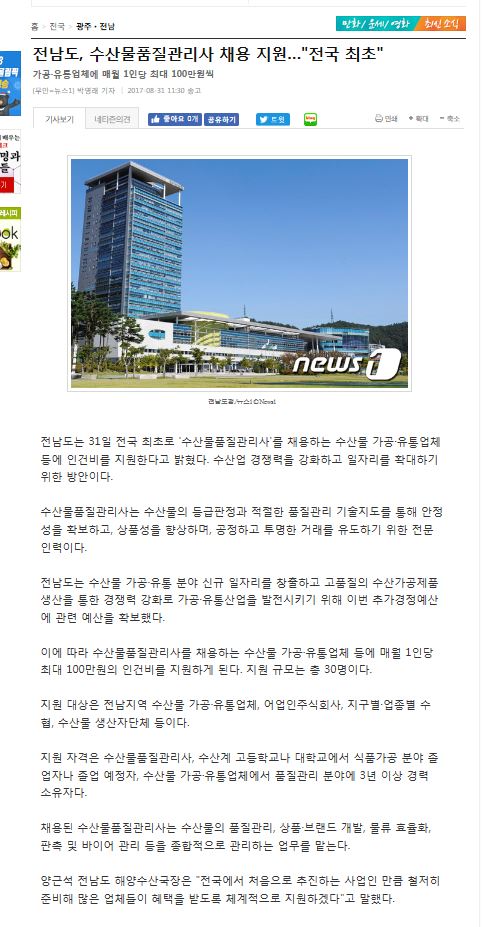전남도, 수산물품질관리사 채용 지원…"전국 최초"